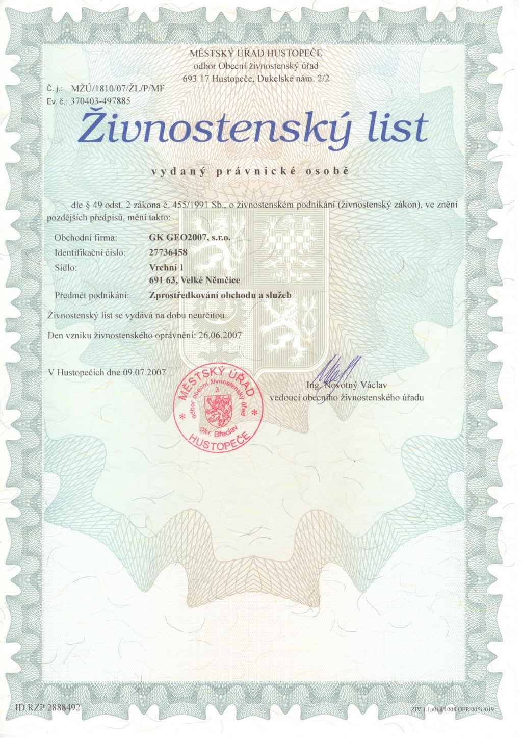 Společnost GK GEO2007, s.r.o. byla založena v červnu roku 2007 a jako společnost s ručením omezeným byla zaregistrována zápisem do obchodního rejstříku u krajského soudu v Brně.